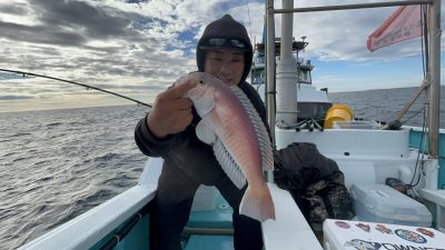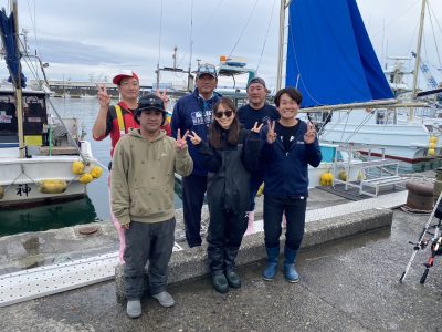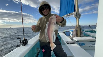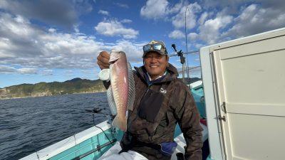 先日真鶴の弟分第八緑龍丸のタカシ船長から連絡が来て以前緑龍丸のお客さんでもあった焼津の岳栄丸君の所へ白アマダイを釣りに行こうと誘いがあり、自分も今年駿河湾の釣り船の新年会で会って仲良くなり最近は東京湾シーバスへ一緒に釣りに行く仲の釣り好き船長岳栄丸の所へタカシとタカシの友達、釣り好きで言わずと知れてる元メジャーリーガーの大魔神佐々木夫妻と5名で白アマダイ釣りに行って来ました。佐々木夫妻とは本船でのタチ釣り以来の久々の再会で朝から皆んな気合い十分。その日のスタイルは他のお客さんも居なかったのでスタンダードなエサ釣り、今話題のアマラバでそれぞれ思い思いのスタイル。朝イチ一投目から佐々木親分エサでキャッチ