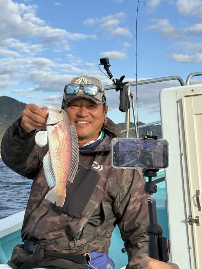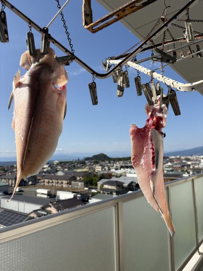 自分も小型で泳いで戻れそうな魚のリリースも入れれば20匹近い白アマダイをエサとアマラバで楽しく釣らせて貰いました。まだ釣り船を始めたばかりの自分の娘世代の岳栄丸岳ちゃんがどんな動きで白アマを攻めていくのか?が実は自分の中では楽しみだったけど、潮変わりの良い時間に多分自分が勝負したい良型が居るポイントだと思うけてどそこに入れてみたり、今が食う時間だろっ?って時の場所移動に普段よりエンジン回して走ってみたり、勝負時を考えた良い動きと釣らせたいって気持ちがスゲー伝わって来て自分が舵を持ってる時のような熱い気持ちにならせて貰えました笑。変な上から目線じゃ無いけど、今後もっと戦績を重ねて行けばどんどん腕を上げて行く先が楽しみな船長だなーって思いました。自分も彼のように頑張ってる若い船長たちに負けず今後ももっと勉強してスキルを上げて行きたいと改めて思った良き日でした。取り敢えず白アマダイちゃんたちは適当に後輩たちにあげて自分は干して食ってみようかと斬新な干し方で笑