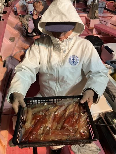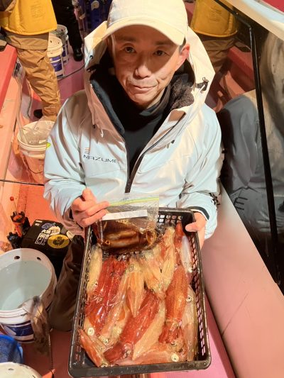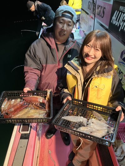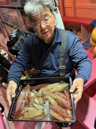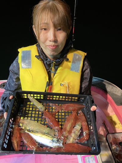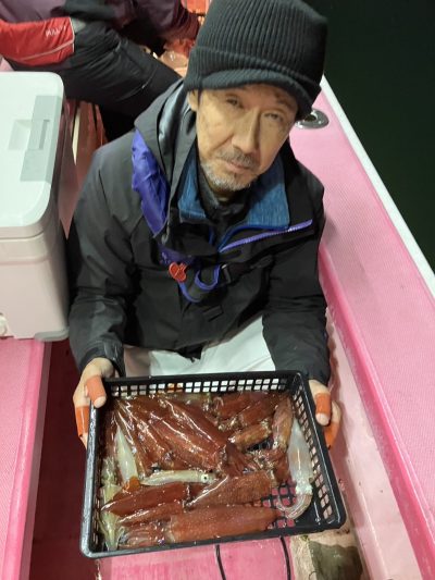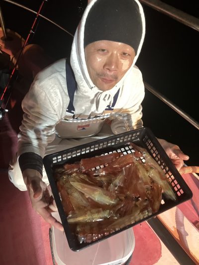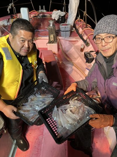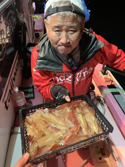 乗り出しは先日同様勢いがあり手返しの速いお客様は釣果を伸ばしました その後はポツリポツリと地味に増える乗り方でした TOPはブッチギリでしたが40杯超が4名30杯3名と比較的平均的に良かったようです 早夜便マルイカ毎晩出船中です 明日も出船致します ご予約受付中です