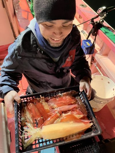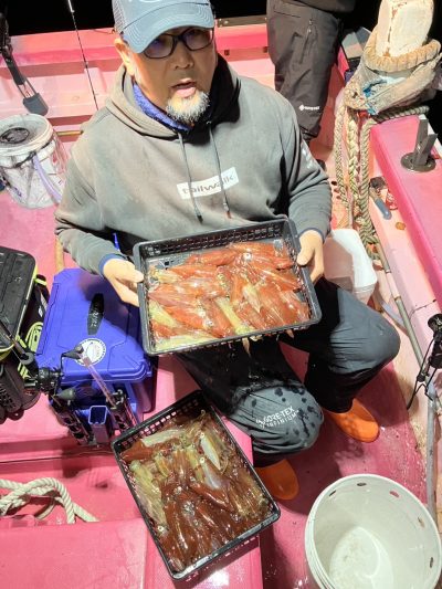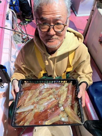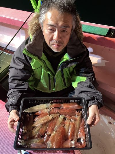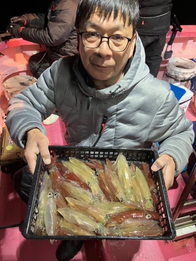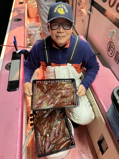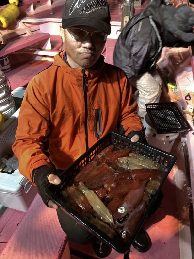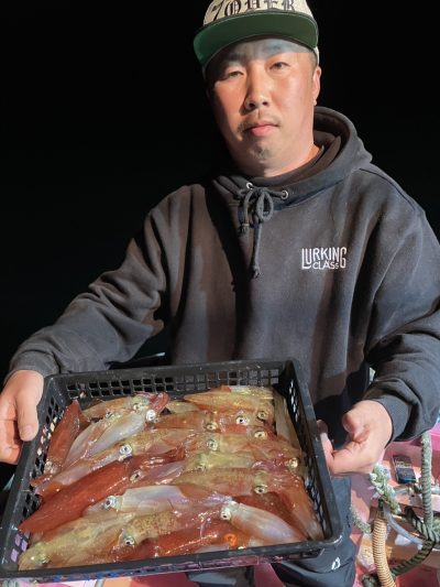 今夜はスタートダッシュからのスタートその後はポツリポツリと釣果を伸ばしたお客様は数を伸ばして行きました 50杯超1名様40杯超3名様と釣果の差は出ましたが比較的乗りは良かったような気がします 引き続き早夜便マルイカ毎晩出船致します ご予約受付中です